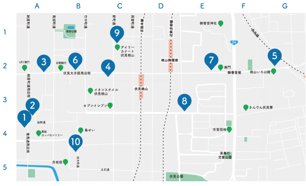 対象エリア大手筋・納屋町・竜馬通り商店街、伏見区役所、伏見城周辺